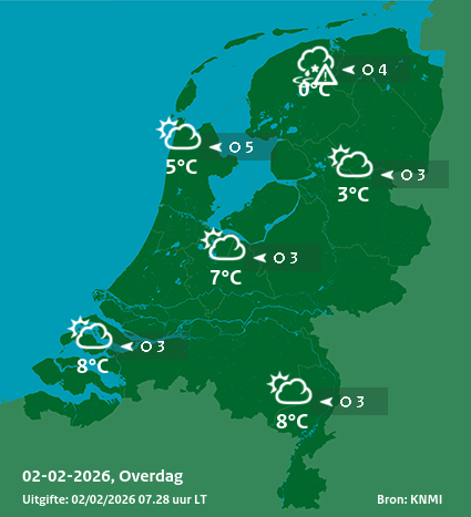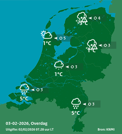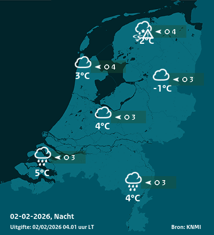 Morgenavond wordt de bewolking weer dikker en gaat er op meerdere plaatsen weer neerslag vallen. Opnieuw is dit in het noorden van het land winters van karakter met kans op gladheid, elders valt voornamelijk regen. In het noorden komt de wind uit het oosten en is matig van kracht, in het noordelijk kustgebied krachtig, mogelijk af en toe hard, windkracht 6 tot 7. In het zuiden komt de wind uit het zuiden en is zwak tot matig. (Bron: KNMI)