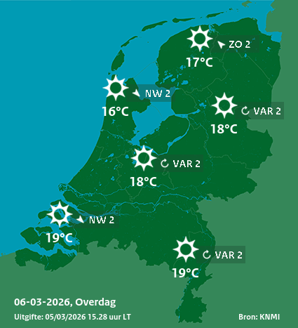 Vanmiddag schijnt de zon volop. De maximumtemperatuur loopt uiteen van 16°C in het noordwesten tot plaatselijk 19°C in het zuiden. Op de Wadden is de temperatuur enkele graden lager. Daarmee is het bijzonder zacht voor de tijd van het jaar. De wind uit het zuidoosten is matig.