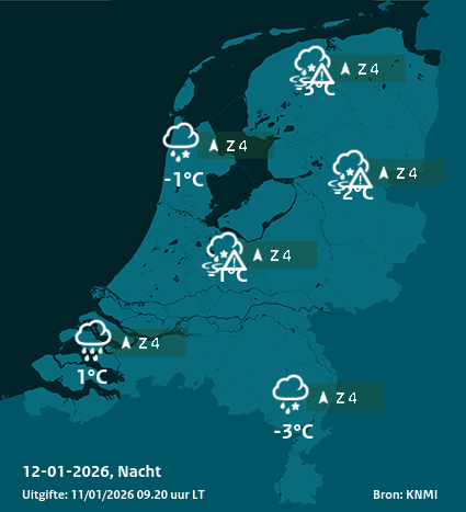 Komende nacht valt er vooral in de oostelijke helft van het land sneeuw en ijzel waardoor het op veel plaatsen verraderlijk glad kan worden. In het westen regent het en verdwijnt de gladheid geleidelijk. De minimumtemperatuur varieert van +2°C in het zuidwesten tot -2°C in het noordoosten. Het waait stevig. Boven land staat een matige tot vrij krachtige wind uit het zuiden. Langs de kust en het IJsselmeer staat een krachtige tot harde wind, windkracht 6-7.