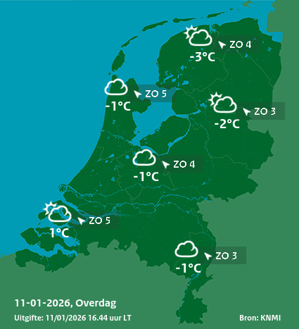 Vanmiddag neemt de bewolking toe maar blijft het nog wel droog. Plaatselijke gladheid blijft mogelijk. De maximumtemperaturen liggen tussen +1°C in Zeeland en -4°C in het noordoosten. Boven land wordt de zuidoostenwind matig, langs de kust en het IJsselmeer neemt de wind toe naar vrij krachtig en later krachtig, windkracht 6.